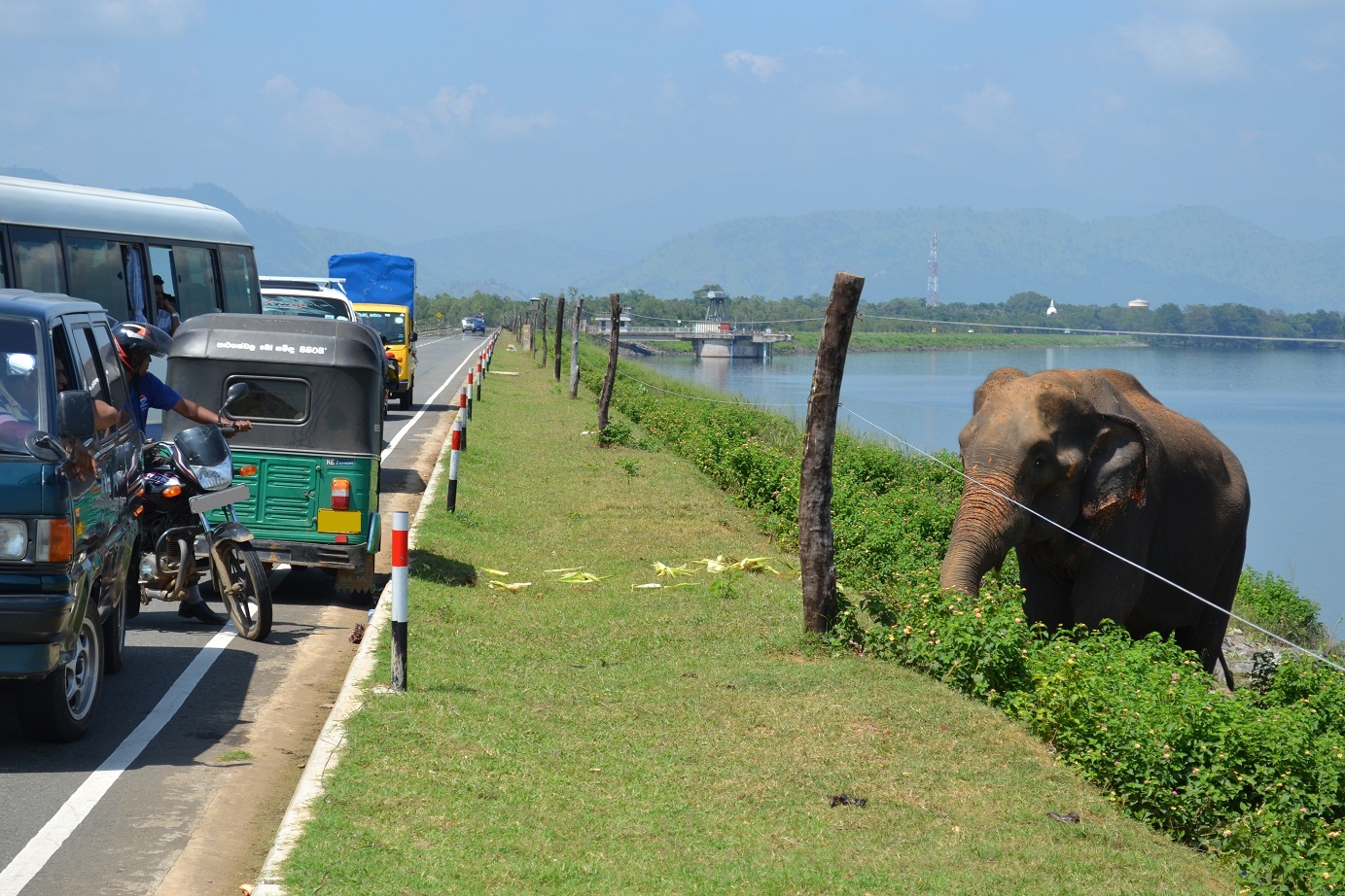 As the rainy season was coming to an end, it was completely filled, and separated from a dry river bed by the dam. In the glistening reflection of the sun, water birds of all sizes and colours gathered, accompanied by water buffaloes enjoying the early morning sun as much as I did. Together with the occasional island and the mountains on the horizon, one could not help but be awed by this vibrant and breathtaking composition. I followed the road over the dam and along the reservoir. Inquisitive and kind as Sri Lankan people are, tuk-tuk passengers smiled, waved or shouted enthusiastically as they went by, and I did the same back. As my walk progressed, however, the atmosphere turned ecstatic. Where at first I blamed my looming sunburn, I noticed that one word echoed from the majority of vehicles. “Aliya”(elephant). I walked on.
