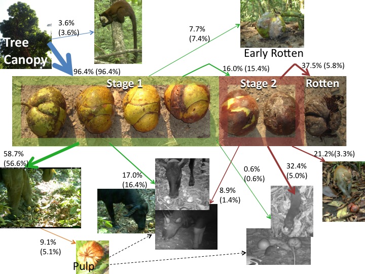The different stages of ripeness exhibited by the Chalta fruit, and the proportion eaten by various forest denizens. The thickness of the arrows correspond to the strength of the relationship (also given in numbers). Figure 3 from Sekar et al. 2013.