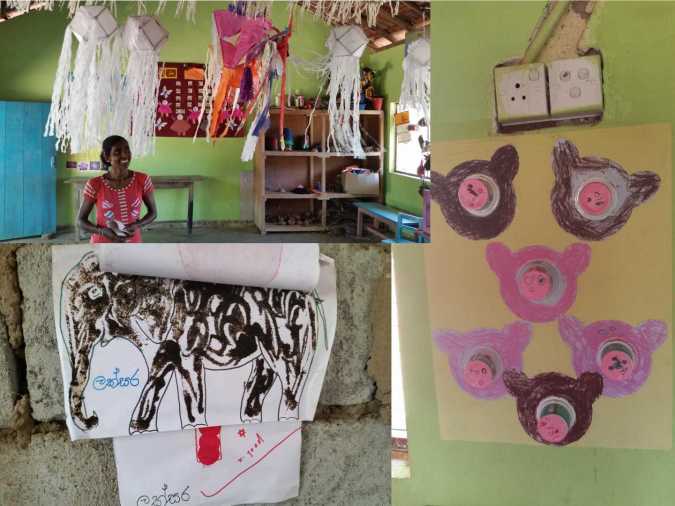 Ms. Managalika of Wanamal pre-school stands beneath colorful lanterns floating in her classroom; resourceful artwork adorns the walls all the schools.