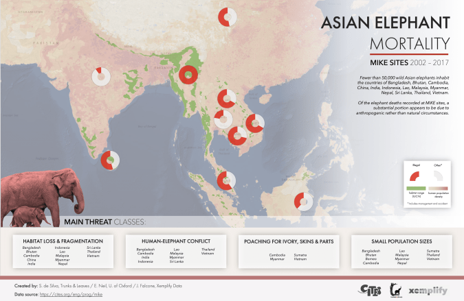 The study highlights a little-appreciated fact: the biggest threat to Asian elephants is habitat loss, followed by illegal trade in live animals and body parts (see here and here). The demographic consequences may be hidden, and take a long time coming but they can be insidious. Many elephant populations in Asia are already so fragmented that they number in the tens or hundreds. The way to recover these populations is to focus on improving the survival of females and calves, as well as their breeding rates, To do that, we need to address issues like land-use change alongside illegal trafficking. Conservation efforts also need to place much greater emphasis on the distinct populations that constitute a species, and whether they are healthy, than on ballpark estimates of how many individuals of the species there are throughout their range. The idea of “demographic safe space” helps to identify which populations are healthy, and which ones aren’t.