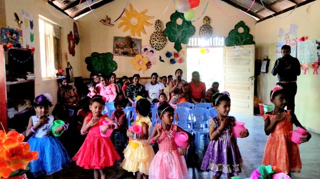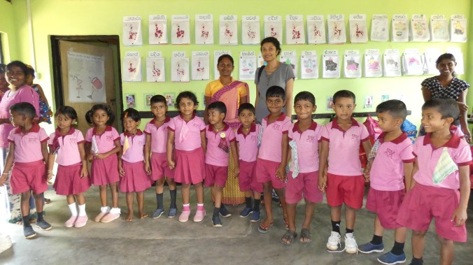 At Sigithi Divihuru the children greeted us with bunches of paper flowers. We were cheered up by a special treat – they had rehearsed a little dance for us. Because our entertainers were outfitted in colorful dresses, we were thoroughly amused to learn in the end that all but one were actually boys! Possibly the girls had been too shy? Cupboards, shelves and playground equipment were the chosen investments at this school.
