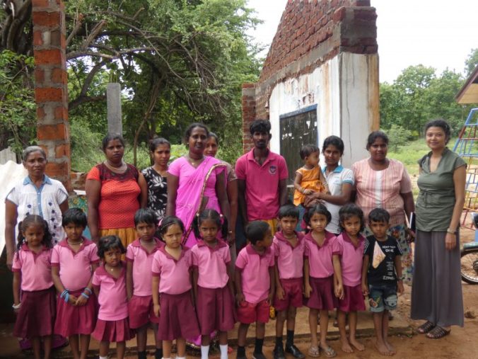 The next stop was Visakha preschool, which was in need of a fence and gate. Sitting next to a busy road, the fence had previously consisted of sticks and wooden posts. The teacher, Ms. Sriyani, worried that a child might run onto the road and cause an accident. They therefore invested in a chain-link fence, with sturdy metal gates. We were greeted with a ceremonious “ribbon cutting” and betel leaves presented by the children. As it was approaching lunch time, we chatted with the parents as the children got ready for their meals, learning about their concerns as we had done at each of the previous locations.