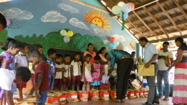 Our first stop was Samagi preschool, where we were pleased to see a very large contingent of parents attending. Together with the teachers, we took turns lighting a tall brass oil lamp, a traditional symbol of good fortune and prosperity in Sri Lanka. We were a bit nervous when they tried to hand the kids a match, but then it was decided it might not be quite such a good idea!