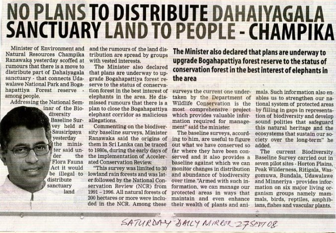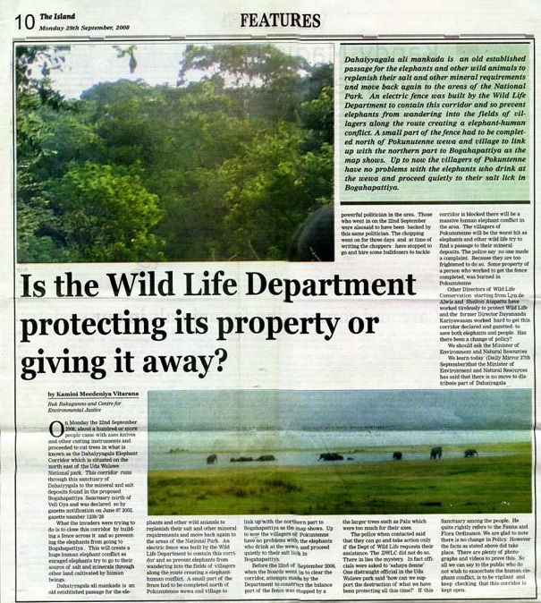 Although for years the Department of Wildlife Conservation had been trying to gazette the area they referred to as Bogahapattiya as a protected area, it never succeeded. Being a patchwork of lands belonging to the Forest Department (which generally doesn’t get along with the Wildlife Department), a local temple, and other private interests, Bogahapattiya itself has been encroached and is under constant threat from rich, land-grabbing developers. And it is to this secret Eden which the elephants of Udawalawe and droves of other wildlife seem to move via the narrow strip of forest known as Dahaiyagala and the mosaic of agricultural fields around it. Fortunately, in 2015, under revised mandate, the Department of Forest Conservation made good on its promise to gazette a the large tract of land that it referred to as Bogahapalessa. But a clear connection between the DWC-managed Dahaiyagala corridor and DFC-managed Bogahapalessa never came to be. It’s because of the disputed status of these connecting lands that Dahaiyagala has long been eyed greedily by those who want to get their political edge by pandering to the ever-present desire of people for more cultivation land. Legally-speaking, Dahaiyagala is a corridor to nowhere. Biologically, it could have been a pathway to heaven. But unfortunately, that pathway falls short.