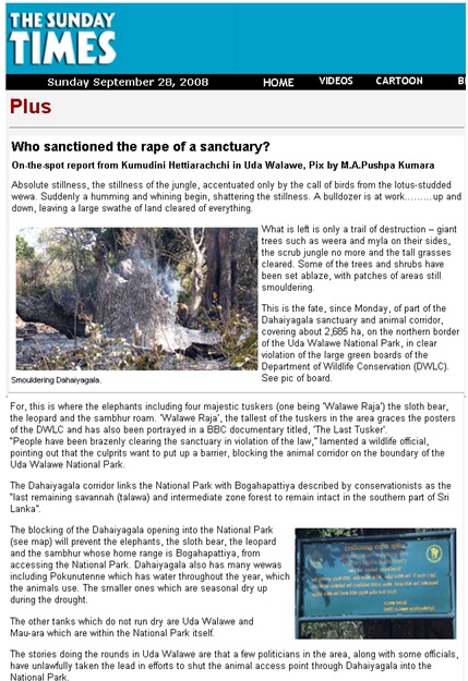 Dahaiyagala which was hardly of adequate size to begin with, has already been severely encroached to the point that it peters out into nothing. Though it should have been around 6km, as the imagery shows, the forested area is barely half of that. What’s more, it doesn’t go directly in the direction of the soil consumption sites at all, so wildlife have to take a circuitous route skirting around croplands. This came to a head in September of 2008 when the UWERP team discovered during a routine survey of the park that someone had started clearing land on the corridor and even penetrated into the park itself. Udawalawe saw few tourists in those days (and even now tours rarely visit the northern edges of the park) so the illegal land clearing had gone largely undetected. Alerting authorities, we learned that the DWC had been in a struggle against a local politician who had forcefully seized the land, saying that it was of no use to elephants. They asked: could we provide data and evidence to the contrary? It so happened that through individual identification, we were able to show that there were seasonal changes to the elephant population in Udawalawe National Park (published later in a study showing that the circulating elephant population of 800-12000 animals was at least twice as high as casual estimates suggested). The data and much public outcry (see image collection below) helped conservation groups and the DWC to successfully mount and win a legal challenge protecting the corridor. Successful, until now.