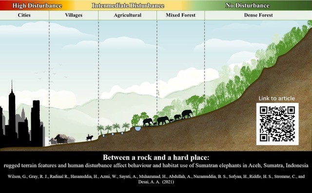 Wilson, G., Gray, R. J., Radinal, R., Hasanuddin, H., Azmi, W., Sayuti, A., … & Desai, A. A. Between a rock and a hard place: rugged terrain features and human disturbance affect behaviour and habitat use of Sumatran elephants in Aceh, Sumatra, Indonesia. Biodiversity and Conservation, 1-22.