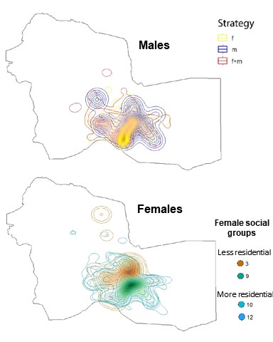 Female Asian elephants have complex social behaviors. Day to day, females spend time in small social groups of only 2-3 individuals, but they also form much larger social communities over long time periods (months to years). We found that in Udawalawe, females with strong social associations had more similar park use to each other compared to those with weaker social associations. In the larger social communities, many females used the park on a longer-term basis. Other females in the population were only seen in a couple of years. Females that used the park on a long-term basis were considered residents, but half of the female population did not meet this criterion, and only used the park during part of their lives. One of the main take-aways from this set of results is that social groups do not necessarily all travel together in and out of the park. Based on earlier research we already knew that social relationships could shift from year to year, so this shows that the decision to move is partly related to what social companions are doing but also depends on individuals’ own choices.